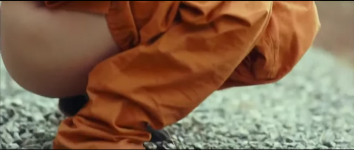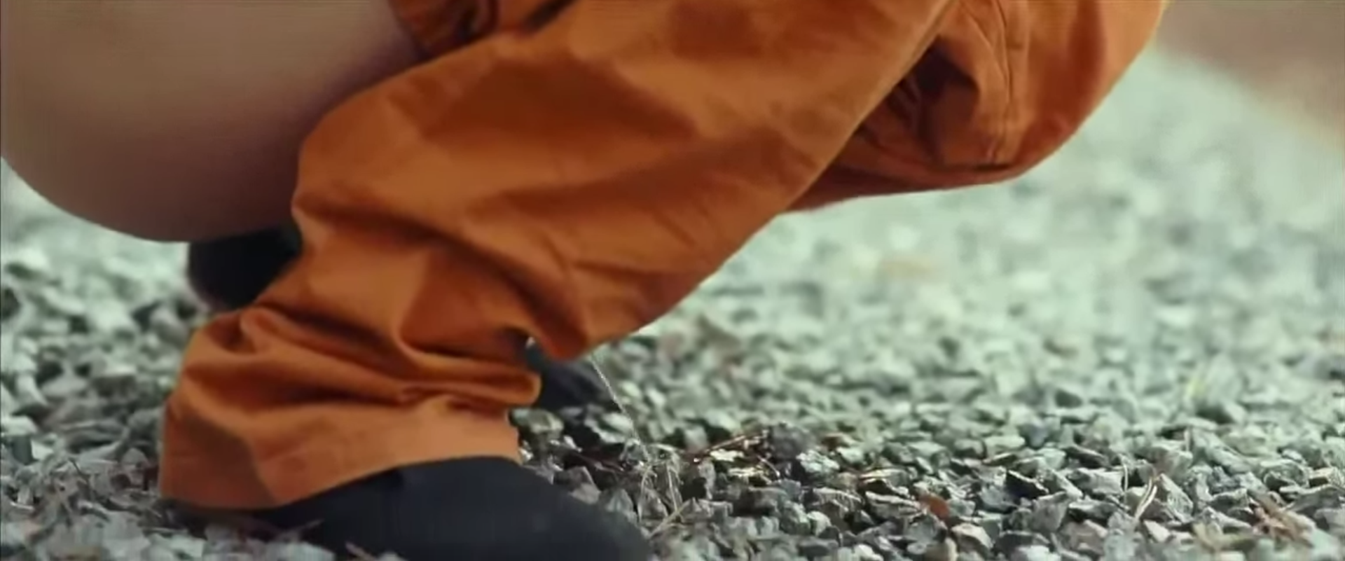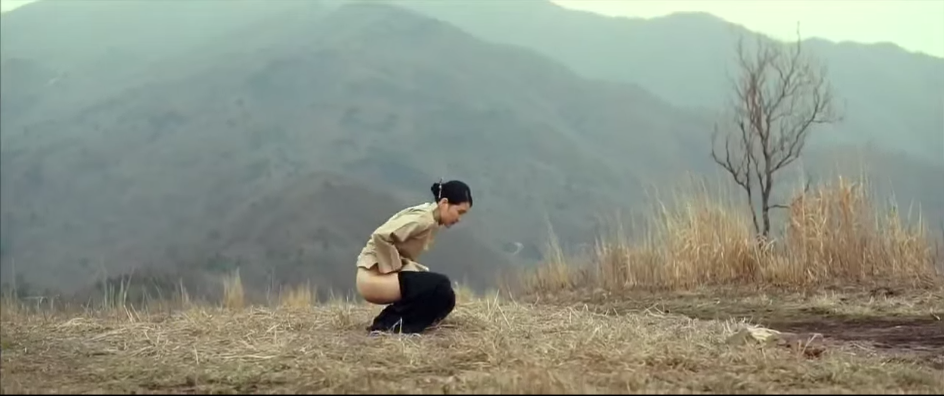 A Japanese girl appears urinating in the middle of the road. The small stream of urine between her legs is shown.