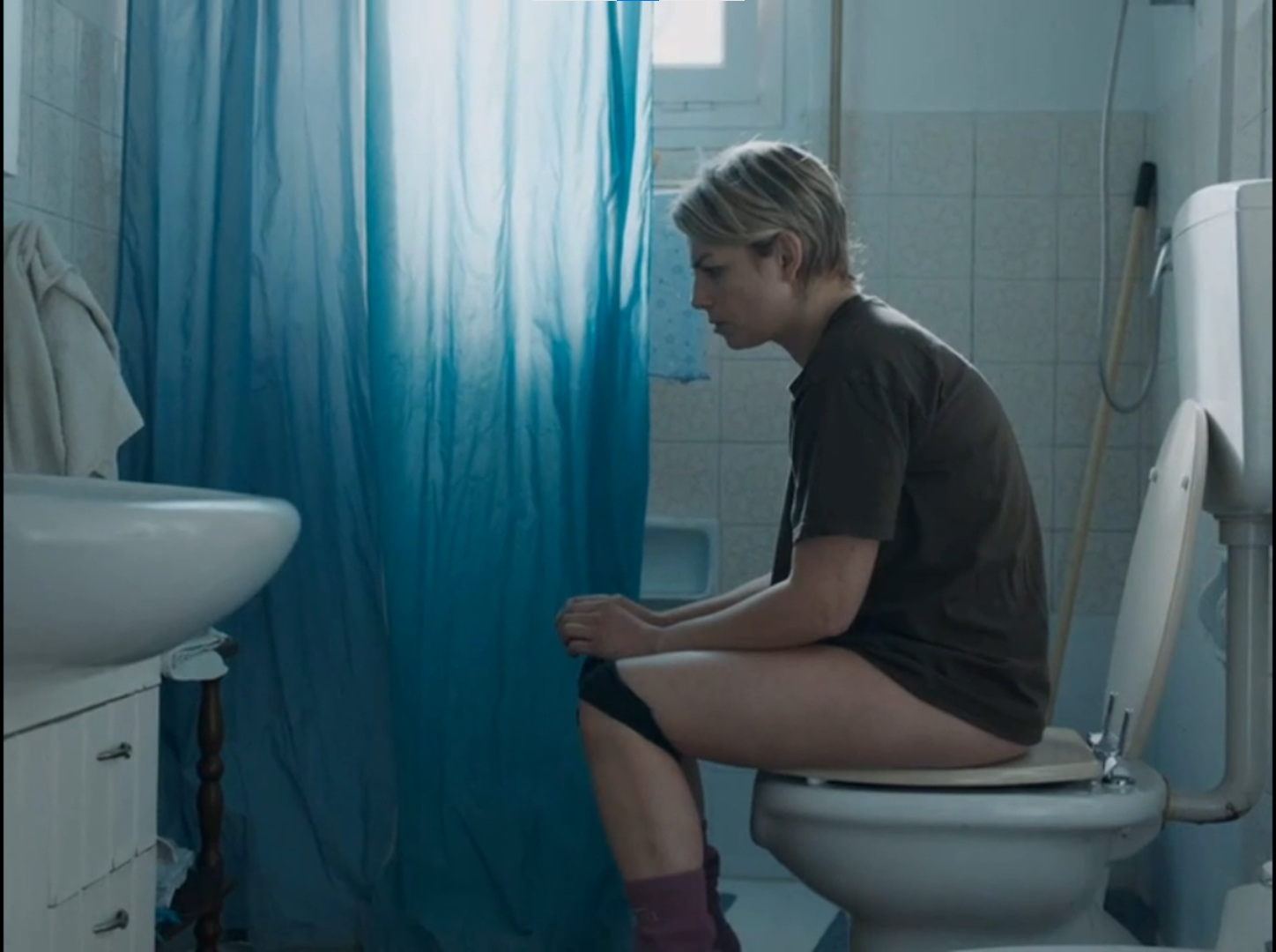 Teresa (Emma Marrone) is shown sitting on the toilet urinating.