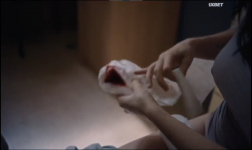 Jenny (Emma Nova) appears sitting on the toilet urinating from the waist up, showing her bare breasts.