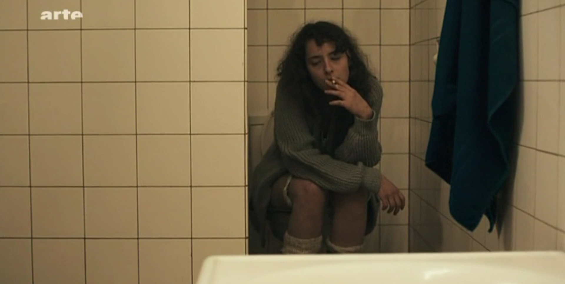 Ana (Salomé Richard) pulls down her panties and sits on the toilet to urinate.