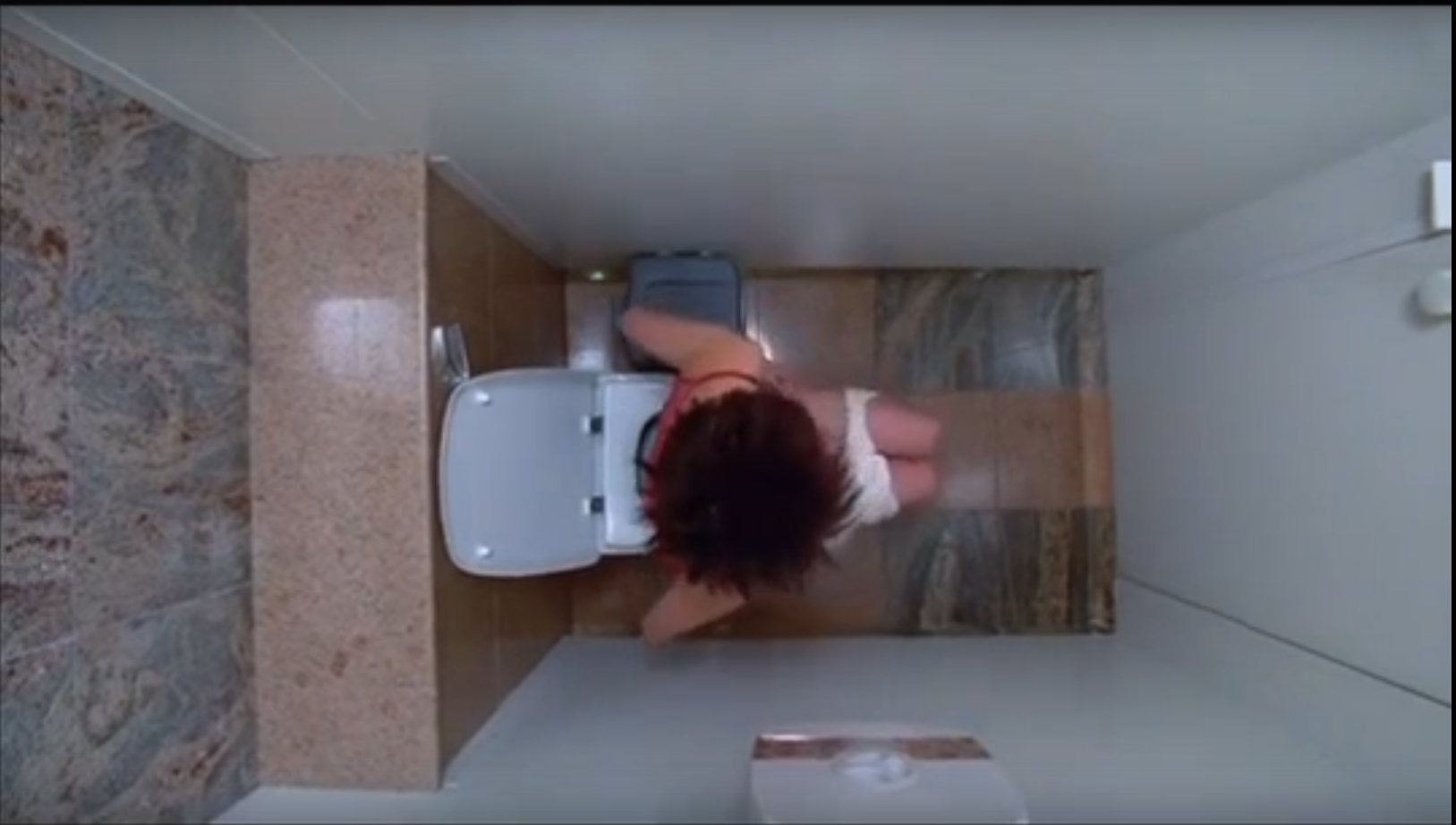 While a group of four girls are chatting in the cubicle, one enters, pulls down her panties, and sits on the toilet with a view from above. The camera focuses on the others talking quietly so she doesn't notice, while we hear the sound of peeing.