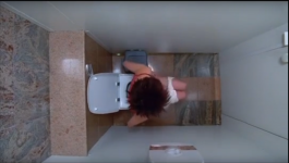 A Japanese girl runs back to the public restroom, pulls down her skirt, and sits on the toilet. She makes grunting noises, and toilet paper appears out of nowhere again, prompting her to ask in fear, “Who's there?” When she realizes it's her boss, she runs away screaming in terror.