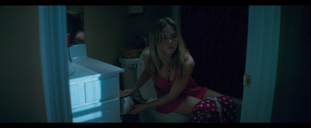 Ashley (Sydney Sweeney) can be seen sitting on the toilet. (26:56)